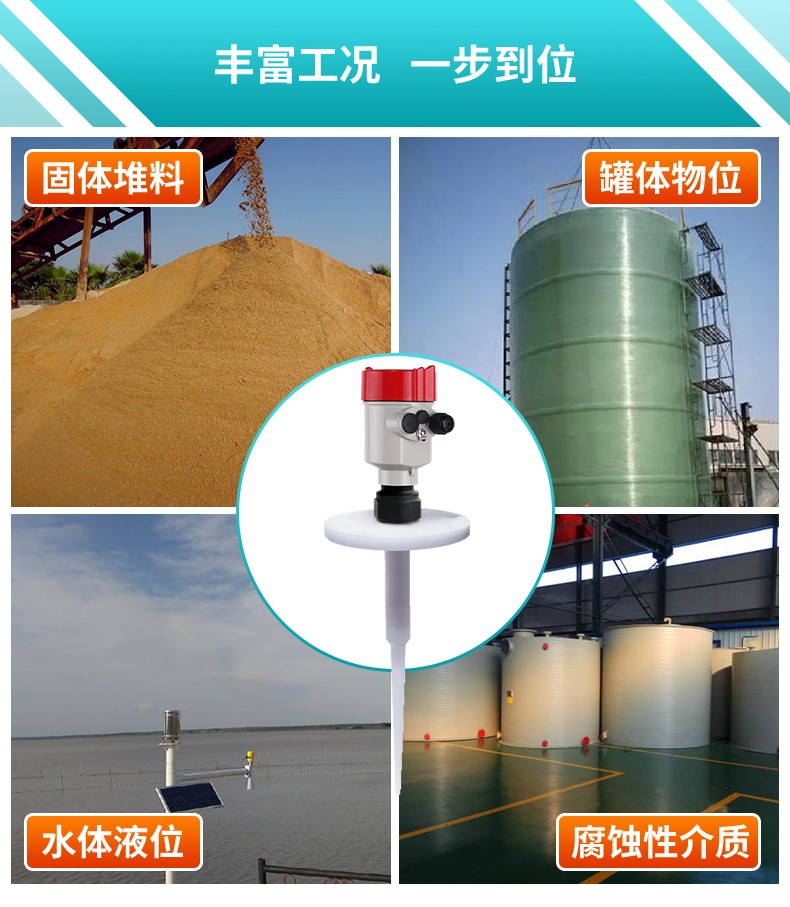 导波雷达的探头有刚性(rigid rod probe)和柔性(flexible cable or rope probe)两种。不便使用刚性探杆(安装空间受限、长量程运输安装困难)时,可使用柔性缆绳,固定末端可使柔性缆绳垂直于倾斜的固体料面;同轴、双探头、单探头结构则根据工况选取,探头长度可根据量程任意切割。